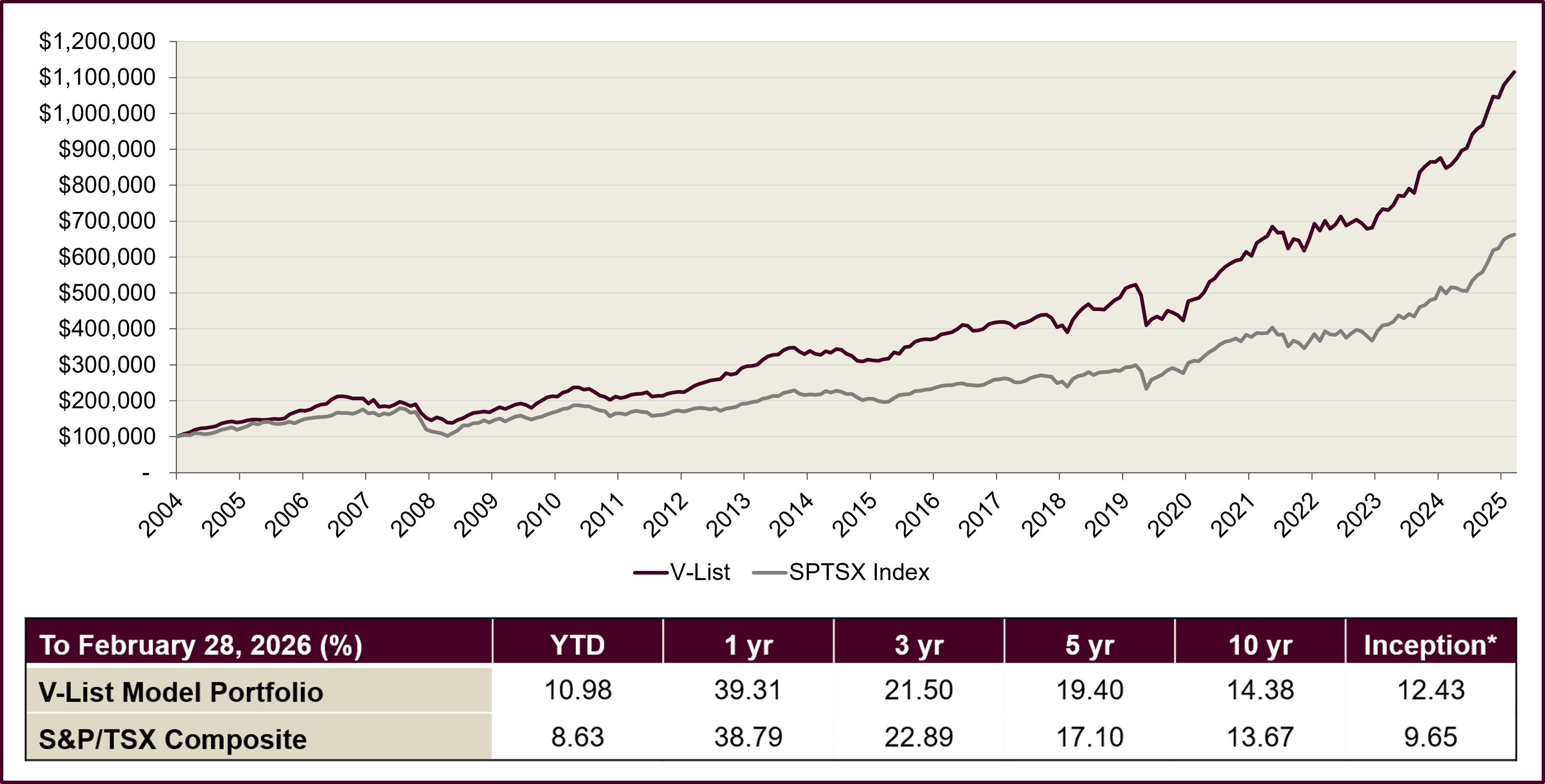 The V-List has outperformed the S&P/TSX Composite Index by 278 basis points (as of February 28, 2026, from inception on October 31, 2004).