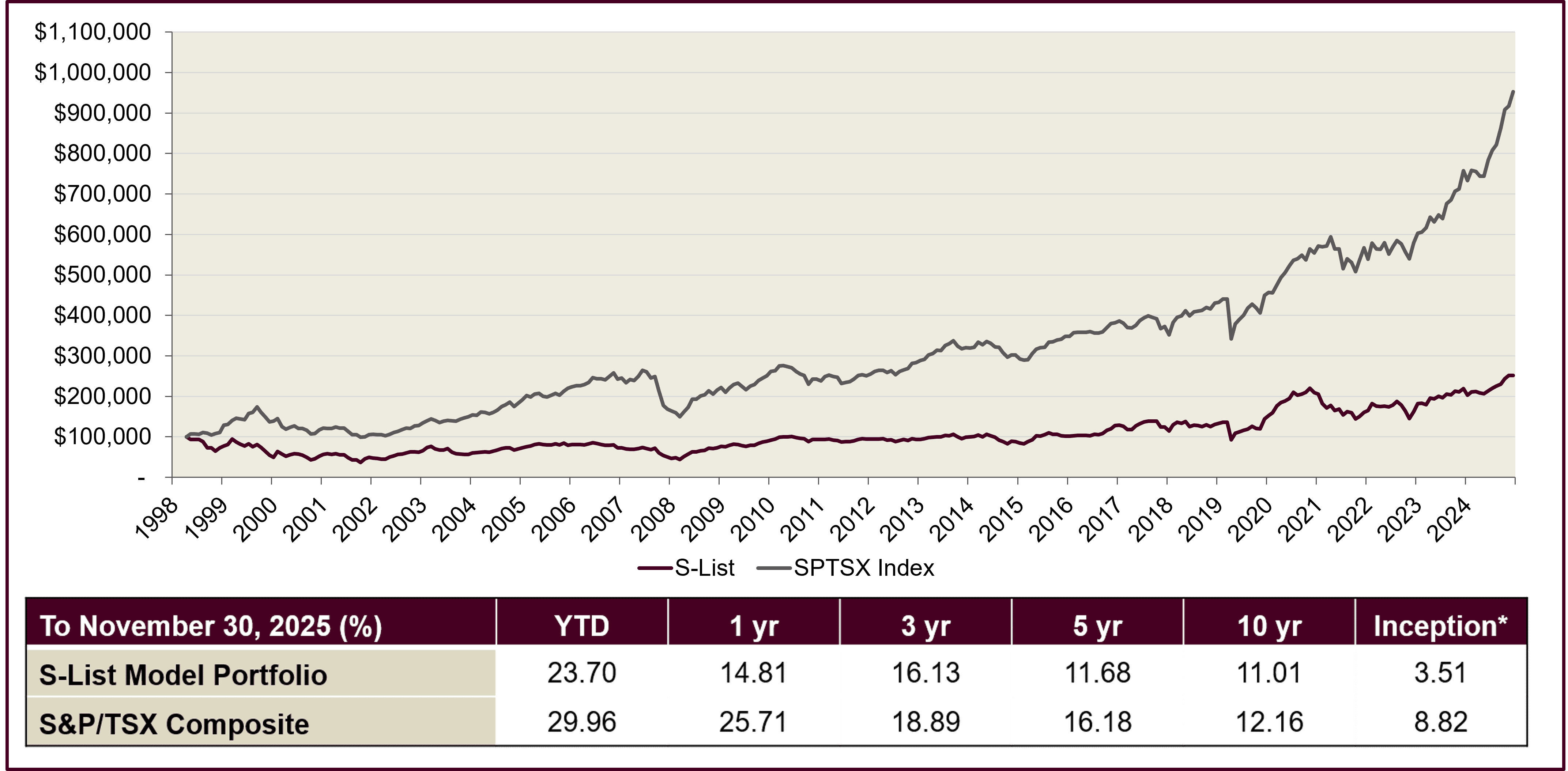 S-List Model Portfolio vs S&P/TSX Index Since 1999 Inception