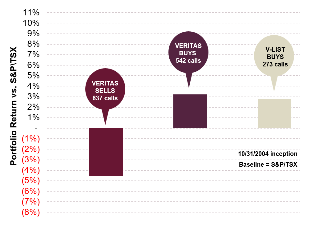 An equal-weighted portfolio of Veritas Sells/Reduces would have underperformed the S&P/TSX index by a compound annual growth rate of 454 basis points.