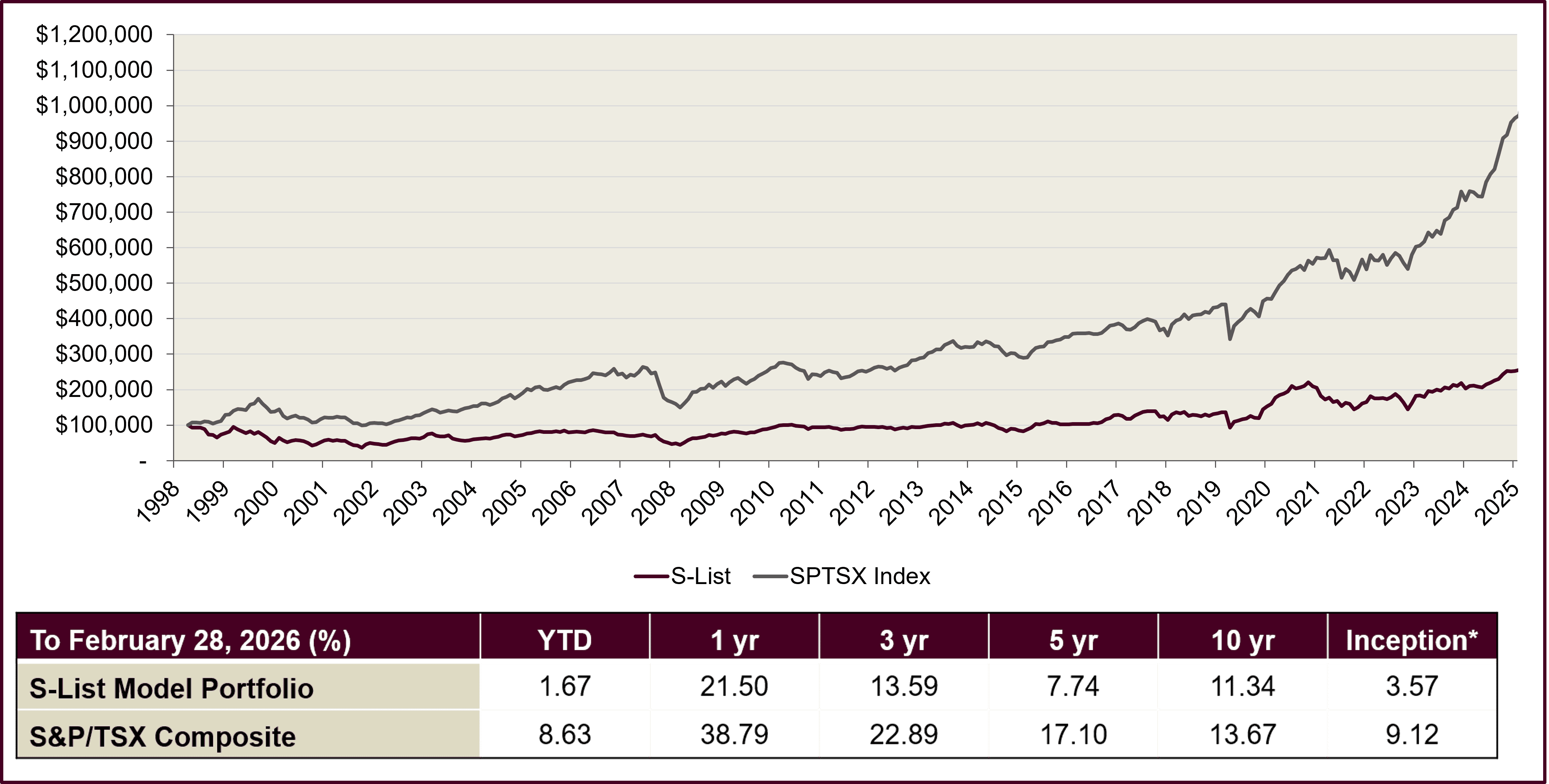 Performance versus the S&P/TSX Composite March 25, 1999 to February 28, 2026