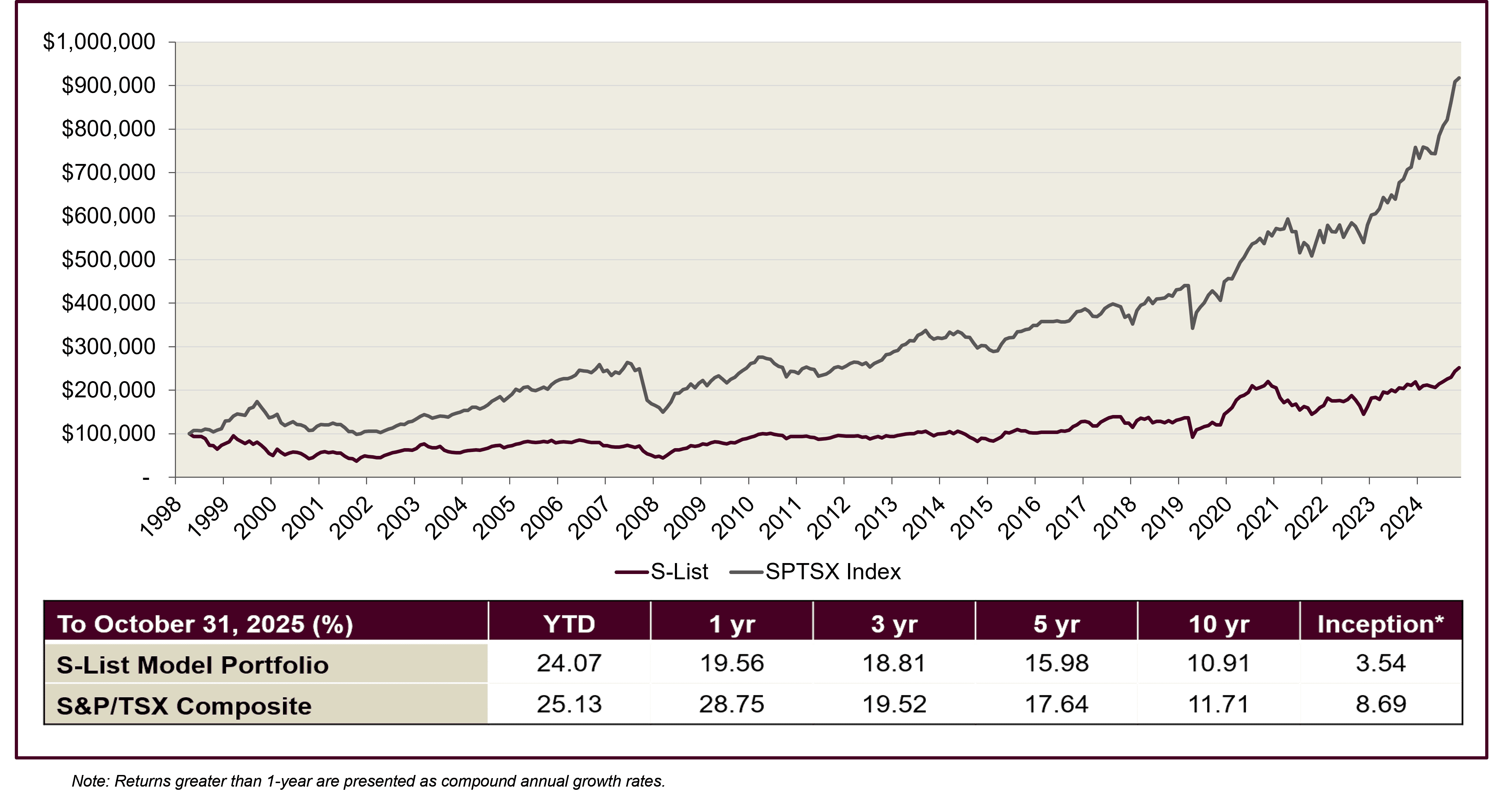 Performance versus the S&P/TSX Composite March 25, 1999 to October 31, 2025