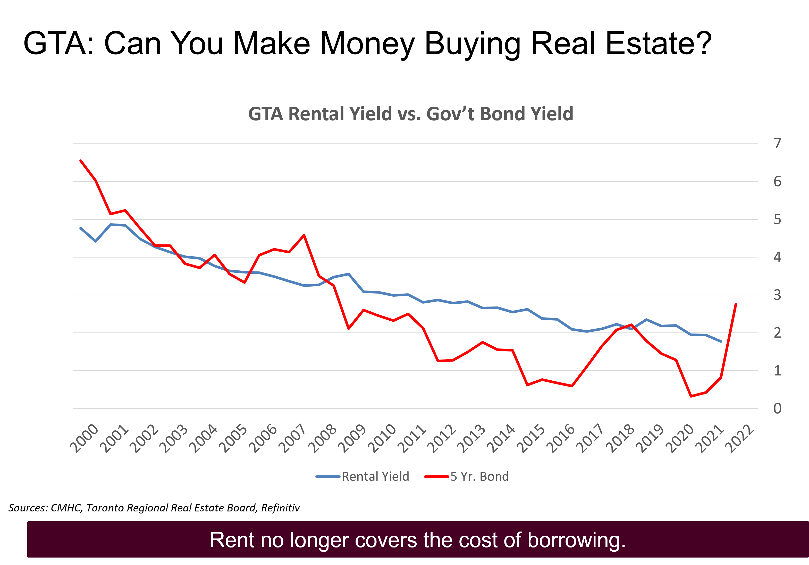 As Anthony told us this week, investors can do better buying boring government bonds than real estate in the GTA these days, as for the first time in years, the rental yield is lower than the five-year bond.